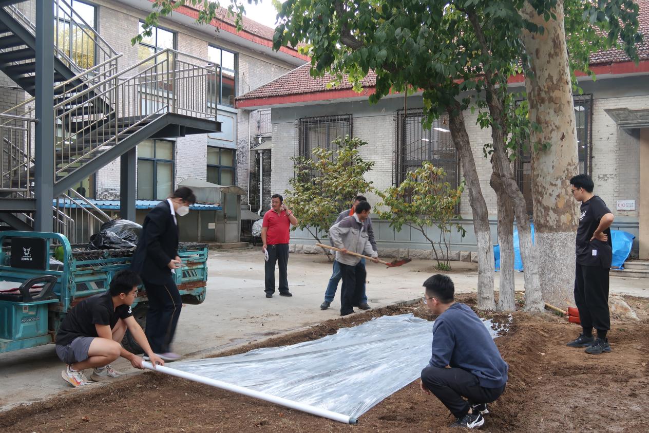 活动伊始,在山东宏泰物业发展有限公司指导教师的示范下,现场的师生首先学习了耕地、规整、灌溉、播种和覆膜的菠菜种植基本方法,并迅速投身到农作实践当中。随着锄头均匀的起落声,师生们的劳动成果已经初显成效,第一期农作试验田约100平方米的土地很快被大家翻了一遍,为菠菜种子的发芽提供松软的土壤环境和充足的空气。随后,大家用耙子将翻起的土壤均匀铺展,清除杂物,进一步平整土地表面,便于播种和管理。经过灌溉以后,土地已经达到了播种的要求,在专业教师的指导下,大家顺利完成了菠菜种子的播种,并在播种过后为土地覆盖好了地膜,进一步为菠菜种子的发芽提供适宜的环境,此次菠菜种植农作实践活动圆满结束。
