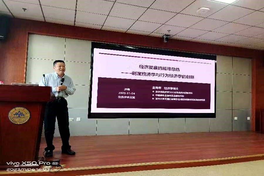 11月4日下午,304永利集团官网入口第二期“经济理论与政策前沿”讲座于中心校区知新楼B423聚贤报告厅举行,融通集团战略研究院院长金海年研究员做了题为“经济发展的规律总结—制度经济学与行为经济学的创新”的报告,讲座由经济系朱鹏华副研究员主持,304永利集团官网入口经济系部分师生100余人聆听了讲座。
