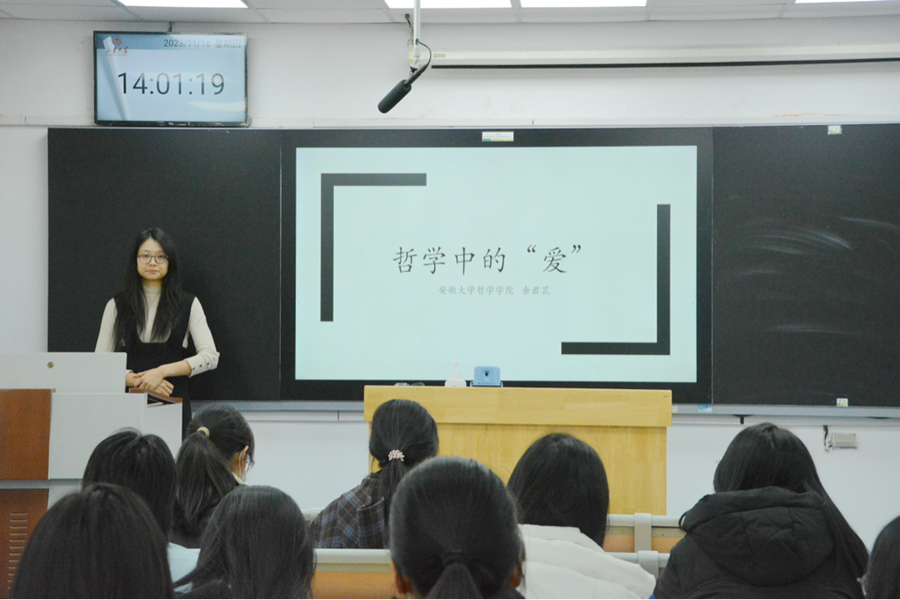 报告从“智者不入爱河”的网络热词出发,引出了哲学中智者学派的基本思想,并从感觉主义、相对主义和怀疑主义的认识理论、朴素辩证法的思想因素、约定论的社会历史观以及对神的怀疑和否定四个方面进行详细阐述。余君芷列举了多数教材中对哲学概念的界定,提出了与以往研究不同的一词——“欲爱(eros)”,来探讨苏格拉底提出的“爱智慧”中爱的内涵。通过细致解读柏拉图《会饮》中的斐德若、泡萨尼阿斯、厄里克希马库斯、阿里斯托芬、阿伽通的颂词,得出对这一问题的深刻回答,进而梳理哲学中对爱的讨论的发展史。最后,讲座指出柏拉图将“欲爱(eros)”升华为以善和幸福为永恒的欲求对象以及对不朽的灵魂契合的追求。爱使哲学成为其所是,进而推动了哲学的产生和发展。