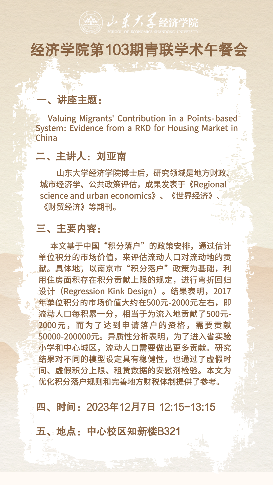Valuing Migrants' Contribution in a Points-based System: Evidence from a RKD for Housing Market in China(304永利集团官网入口第103期青联学术午餐会)